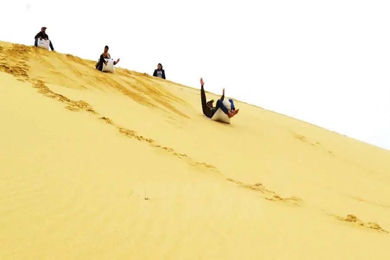 Du khách tha hồ ngắm nhìn những triền cát có vân cát uốn lượn kéo dài cả cây số, xa xa là vẻ đẹp nhà máy phong điện Nhơn Lý với những trụ cột quạt gió khổng lồ sừng sững giữa sa mạc miền Trung trông rất ảo và tận hưởng làn gió từ biển thổi vào mát rượi tạo một cảm giác thật thoải mái.