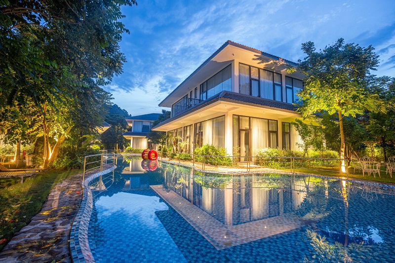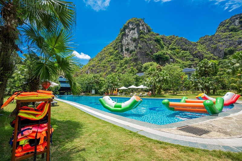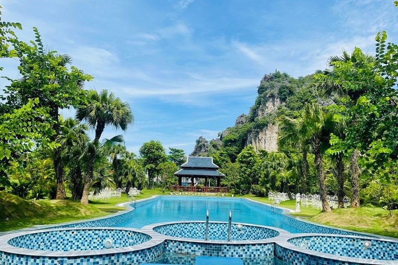 Còn phong cảnh thì hết nước chấm, giống hệt cảnh hẹn hò của của một cặp đôi hoàn cảnh, đó là một bức tranh hài hoà giữa núi đá, rừng cây, sống hồ thung nước, bầu trời và nét kiến trúc thuần việt với nếp nhà sàn, vườn cây ao cá cùng những góc sống ảo tung chảo.